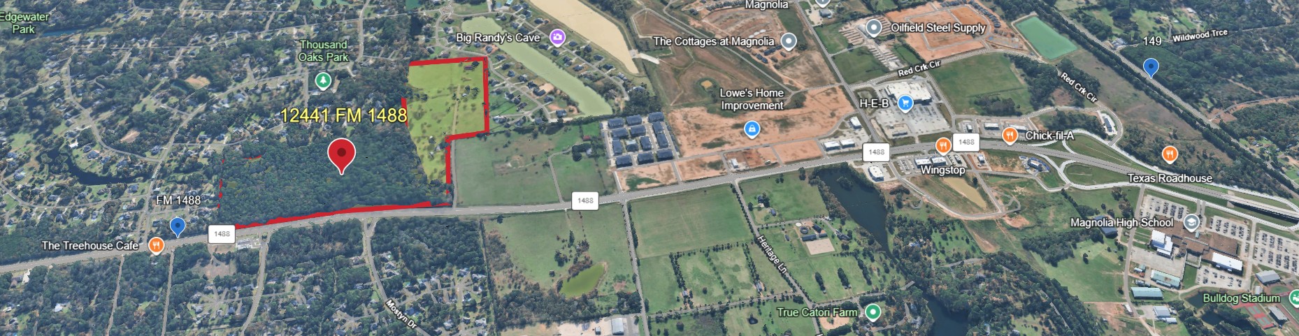 This is a rare opportunity to acquire 73 acres of pristine, undeveloped land with immense potential for future growth. The property is situated in a highly sought-after location, with approximately 2,056 feet of prime frontage along Highway 1488, positioned between the thriving areas of The Woodlands and Magnolia. This location offers exceptional visibility and easy access to major thoroughfares, making it ideal for a variety of commercial, residential, or mixed-use developments.